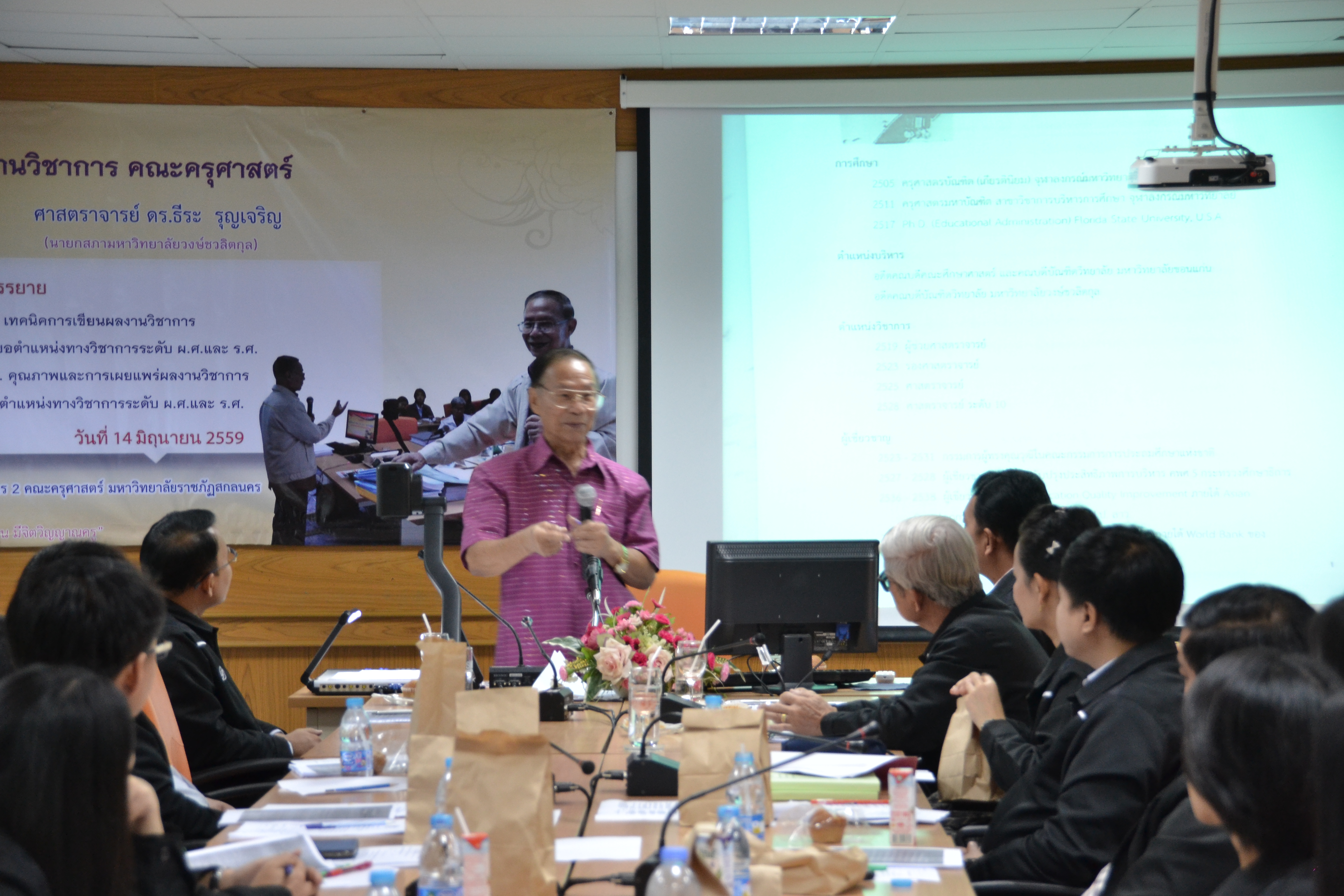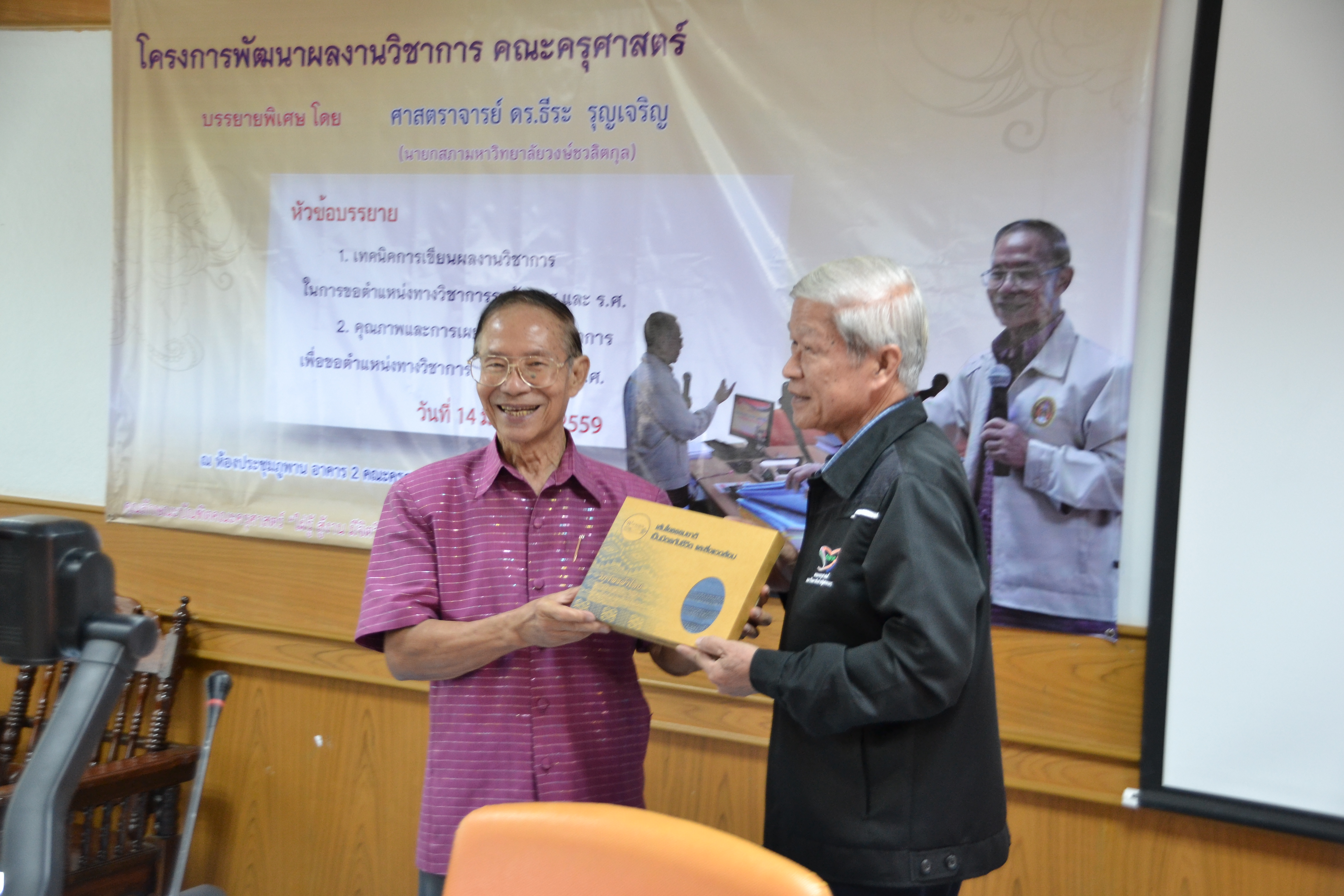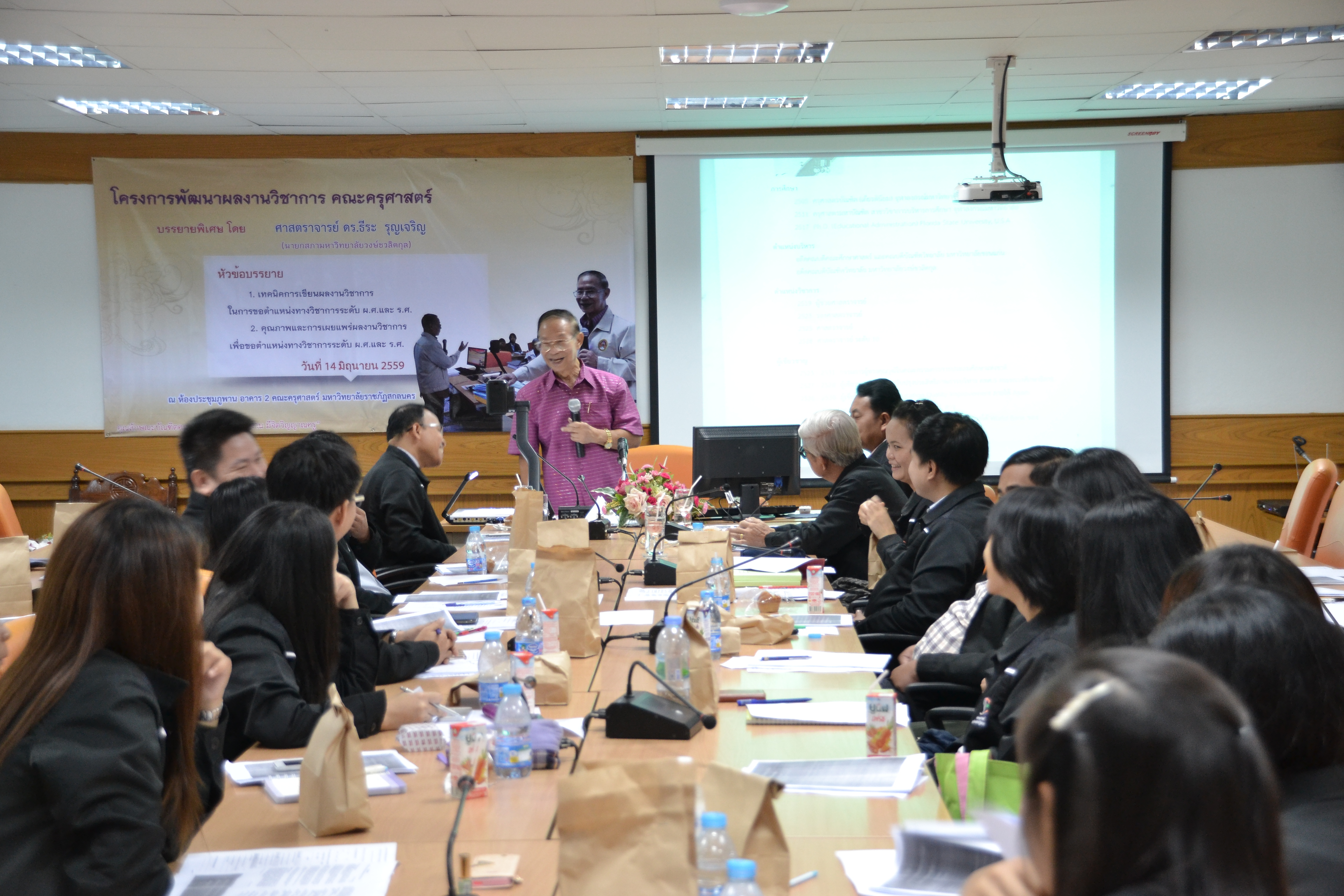 โครงการพัฒนาผลงานทางวิชาการ คณะครุศาสตร์ โดยได้รับเกียรติจาก ศาสตราจารย์ ดร.ธีระ รุญเจริญ เป็นวิทยากรพิเศษ บรรยายหัวข้อ “เทคนิคการเขียนผลงานวิชาการ ในการขอตำแหน่งทางวิชาการ ระดับ ผ.ศ. และ ร.ศ.” วันที่ 14 มิถุนายน 2559 ณ ห้องประชุมภูพาน คณะครุศาสตร์